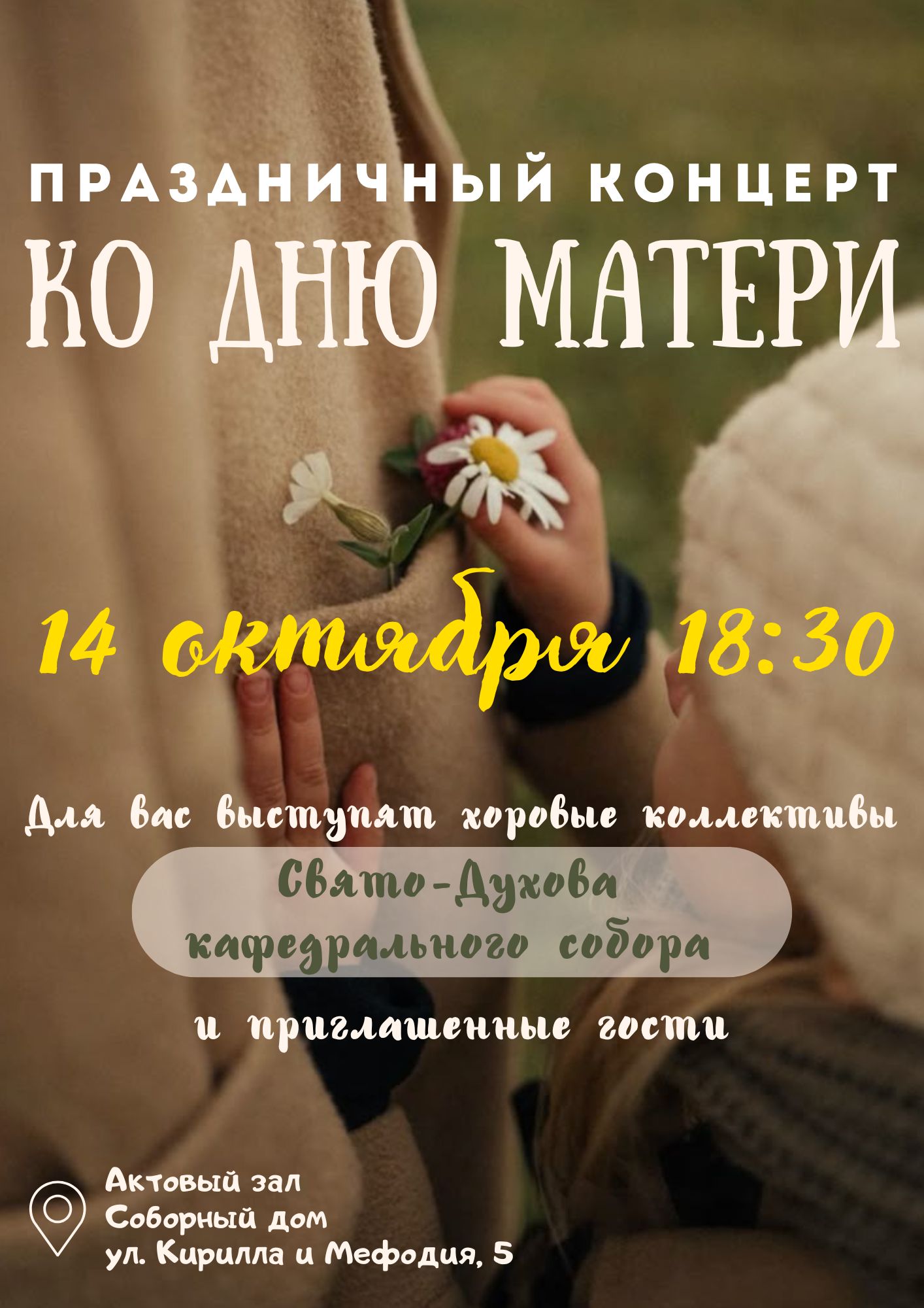 14 октября в 18:30 в соборном доме состоится праздничный концерт посвященный Дню Матери. Юные, начинающие, профессиональные артисты и зрители соберутся в одном месте для того, чтобы совместн...