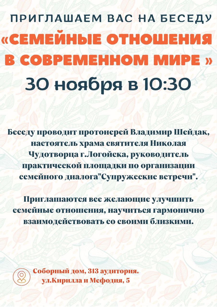 30 ноября 2025 года в 10.30 в Соборном доме Свято-Духова кафедрального собора г.Минска в аудитории 313 состоится беседа на тему «Семейные отношения в современном мире». Беседу проводит...
